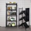 4-Tier Black Folding Shelf Storage Shelves Heavy Duty Foldable Metal Shelving Units Racks with Wheels No Assembly Required Great for Kitchen and Garage Shelf