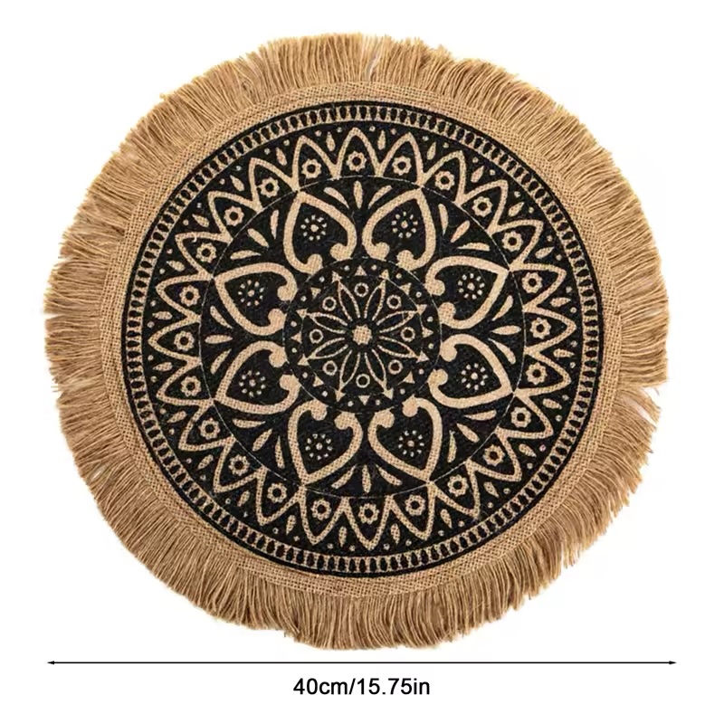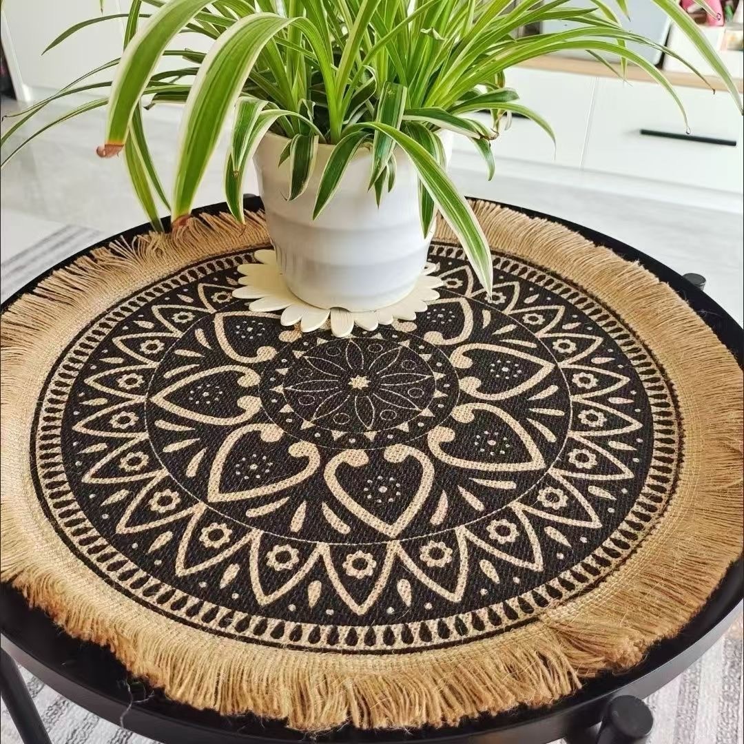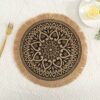 Round Placemat Table Non-Slip Jute Mats for Dining Table Bohemian Brown and Black With Pattern Set of 6